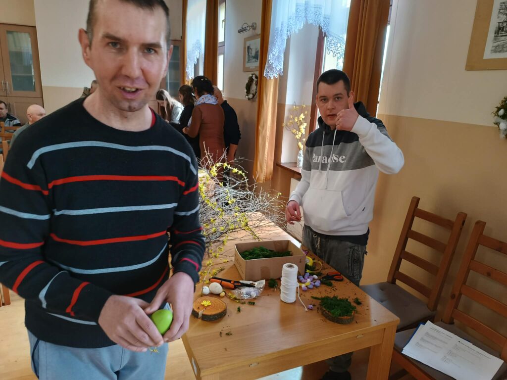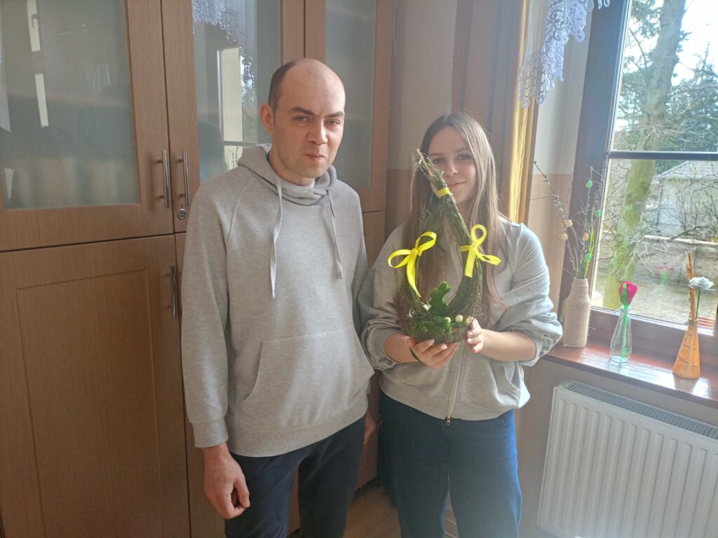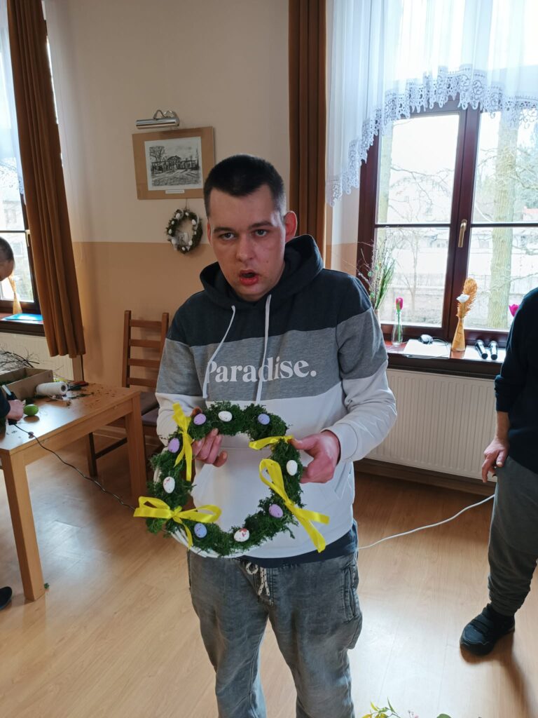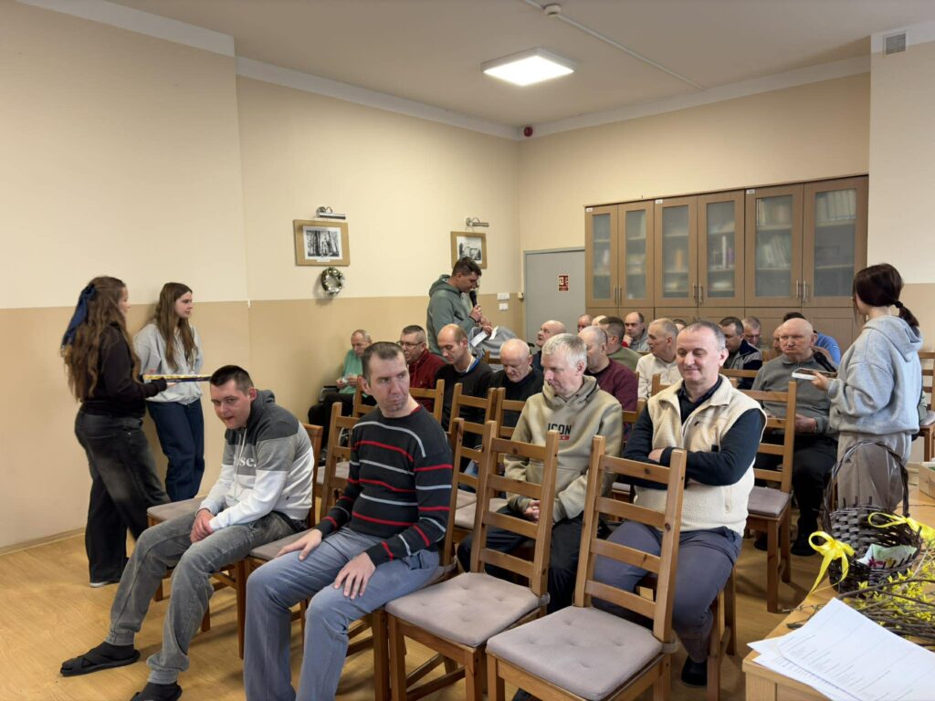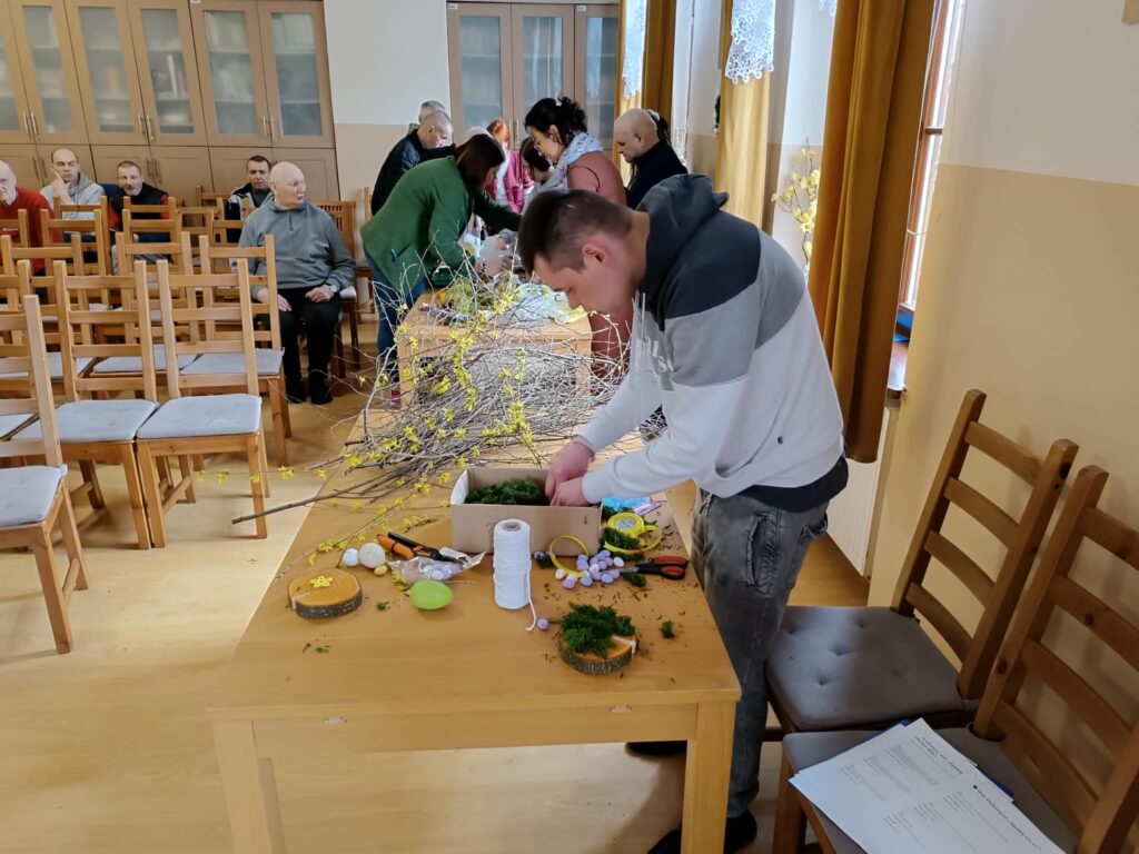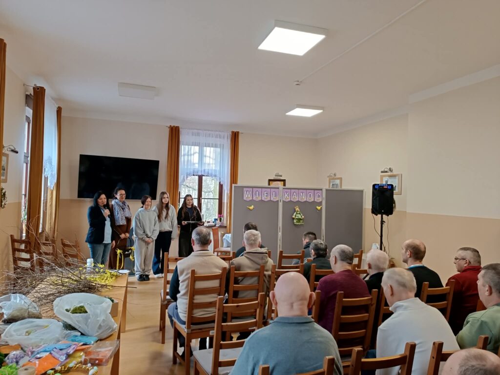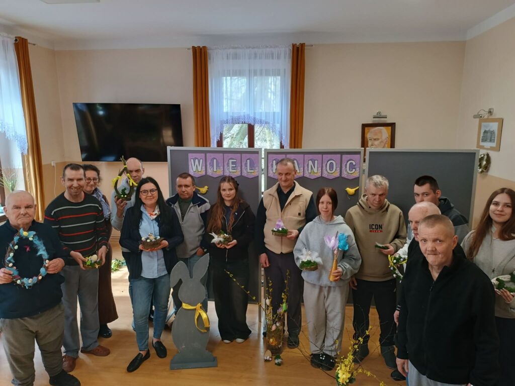 Dnia 31 marca w świetlicy naszego Domu odbyły się wyjątkowe Warsztaty Wielkanocne. Wydarzenie to dostarczyło mieszkańcom wiele radości i okazji do wspólnego spędzenia czasu. Tego dnia odwiedziły nas wolontariuszki z Zespołu Szkół w Wieleniu – Agata, Ola i Lena. Towarzyszyła im pani Joanna, pod której opieką młodzież aktywnie włączyła się w przygotowanie zajęć. Wolontariuszki przygotowały dla mieszkańców quiz o tematyce świątecznej. Pytania były nie tylko ciekawe, ale również wzbogacone o zabawne odpowiedzi, co wywoływało uśmiech na twarzach uczestników. Podczas warsztatów panowała twórcza atmosfera sprzyjająca integracji i dobrej zabawie. Mieszkańcy mieli okazję wykonać własnoręcznie różnorodne ozdoby wielkanocne, takie jak wianki i stroiki. Wolontariuszki z zaangażowaniem pomagały i wspierały uczestników na każdym etapie pracy. Dodatkową atrakcją był quiz „Zgadnij, kto to?”, w którym panowie odgadywali znane postacie na podstawie ich opisu. Zabawa ta wzbudziła wiele emocji i zdrowej rywalizacji. Spotkanie przebiegło w bardzo miłej i serdecznej atmosferze, a w ramach dalszej współpracy wolontariuszki zapowiedziały częstsze wizyty oraz udział w kolejnych warsztatach i przedsięwzięciach. Na zakończenie spotkania uczestnicy mogli skosztować pysznego ciasta – murzynka, który był miłym zwieńczeniem wspólnie spędzonego dnia.